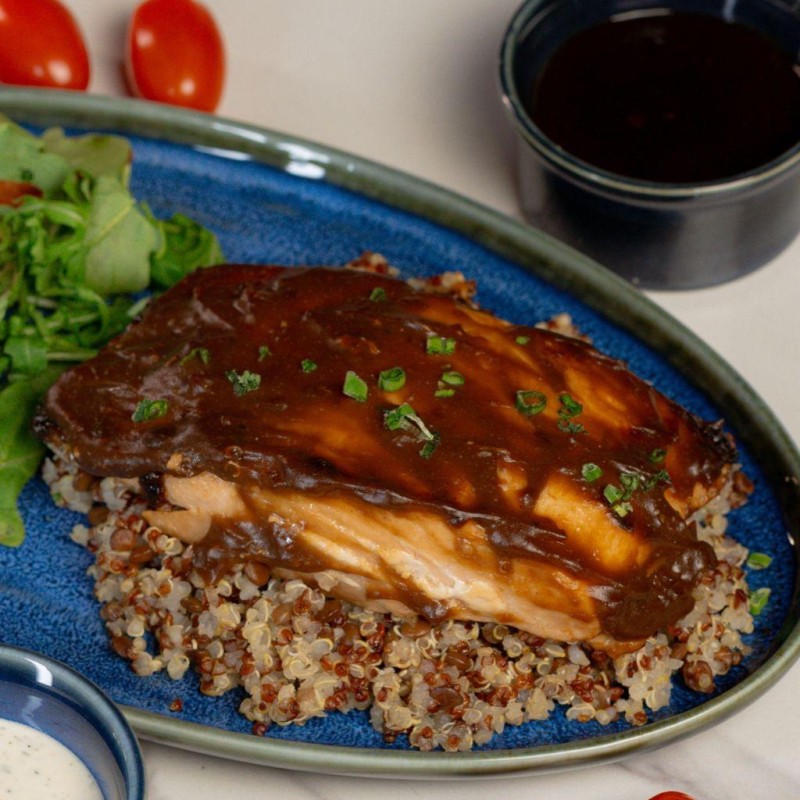 سالمون مشوي بصلصة الترياكي يقدك فوق طبقة من الكينوا والعدس الأسود